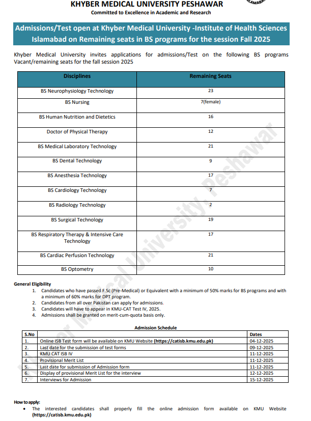 | 1 | Availability of Admission form on https://catisb.kmu.edu.pk | 18.08.2025 |